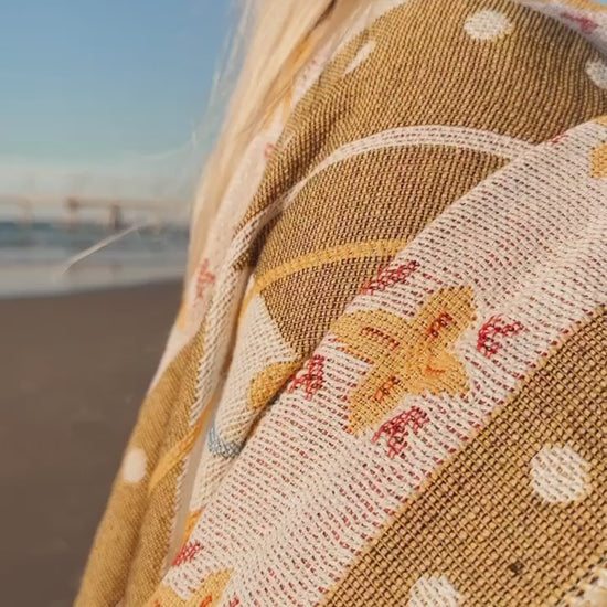 Utilise the 'Golden Sunset' fringed rug in so many ways! Take your rug to the beach, picnic or as a beautiful throw for your bed or lounge.